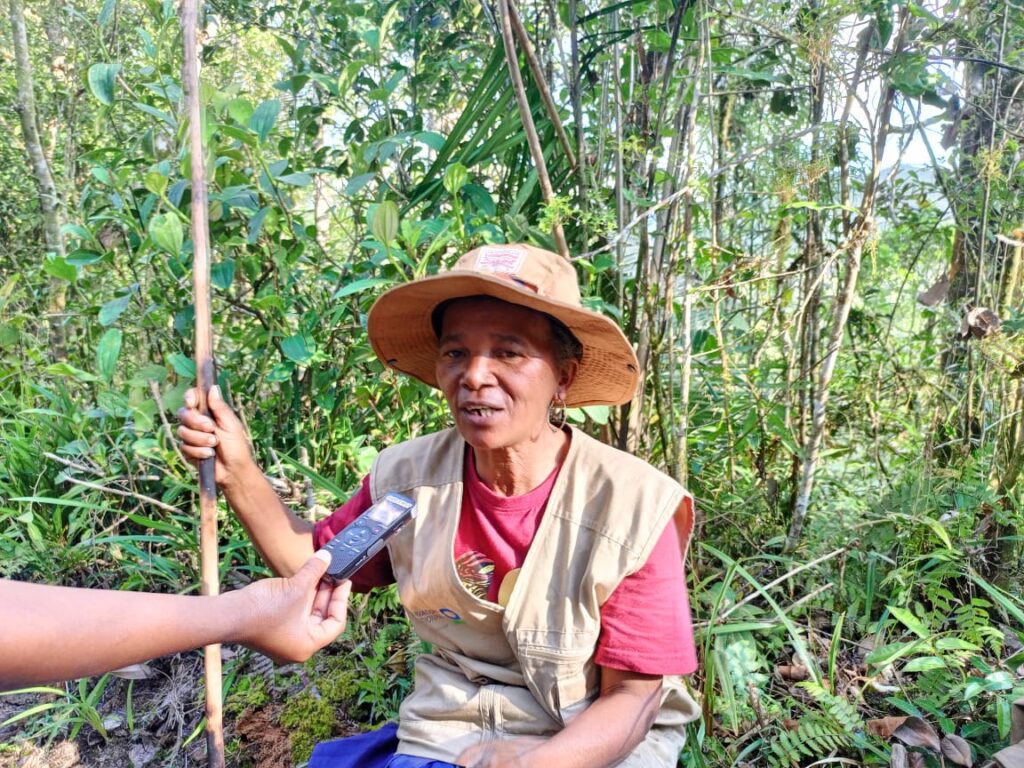 A 15 heures, après trois heures de marche, ils arrivent dans la forêt de Vohibola III. Dès l’entrée, un arbre tombé à terre leur barre le chemin. « Voilà un arbre tombé à terre« , s’écrie Madame Naina, présidente du VOI Parc Zafimaniry, « il faut le photographier rapidement« , poursuit-elle. « Il faut vérifier si cet arbre est tombé naturellement ou s’il a été abattu« , indique-t-elle à ses deux patrouilleurs, connus dans la communauté sous le nom de Polisin’Ala. Le travail de ces inspecteurs forestiers consiste à prendre des photos et des notes. Ils ne se souviennent pas de la fatigue qu’ils ont ressentie après avoir marché pendant 3 heures depuis le village d’Ambohimotombo jusqu’à la forêt de Vohibola III.